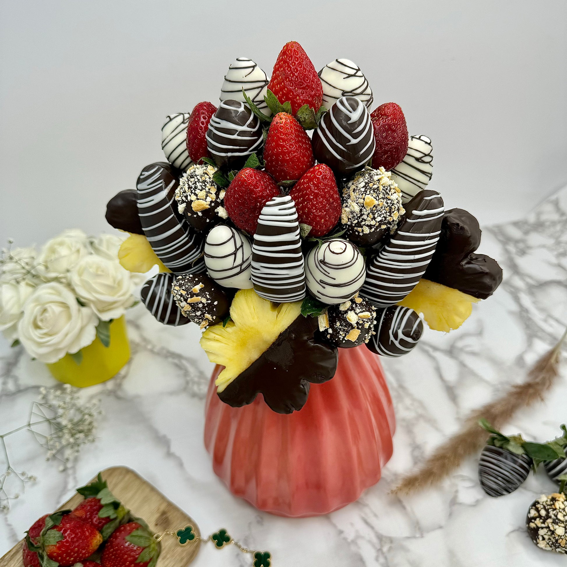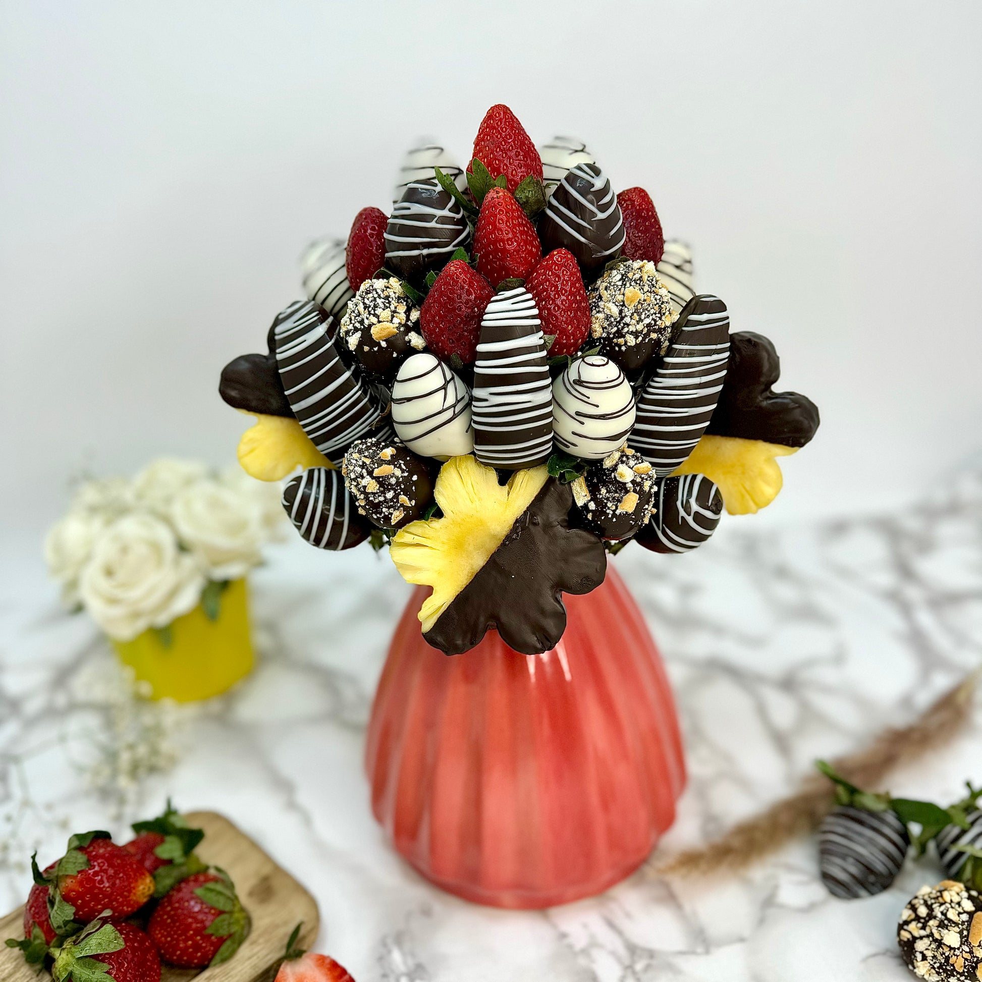 Choco Nutty Surprise is a delightful fusion fruit bouquet featuring 45 delicious sticks of indulgent treats. It includes Dark & White Belgian Chocolate Dipped Strawberries, Dark Belgian Chocolate Dipped Pineapple Daisies, and Dark Belgian Chocolate Dipped Granny Smith Apples, all beautifully arranged for a perfect mix of fresh fruit and rich chocolate. A perfect treat for any occasion, this bouquet offers a harmonious blend of sweetness and crunch.