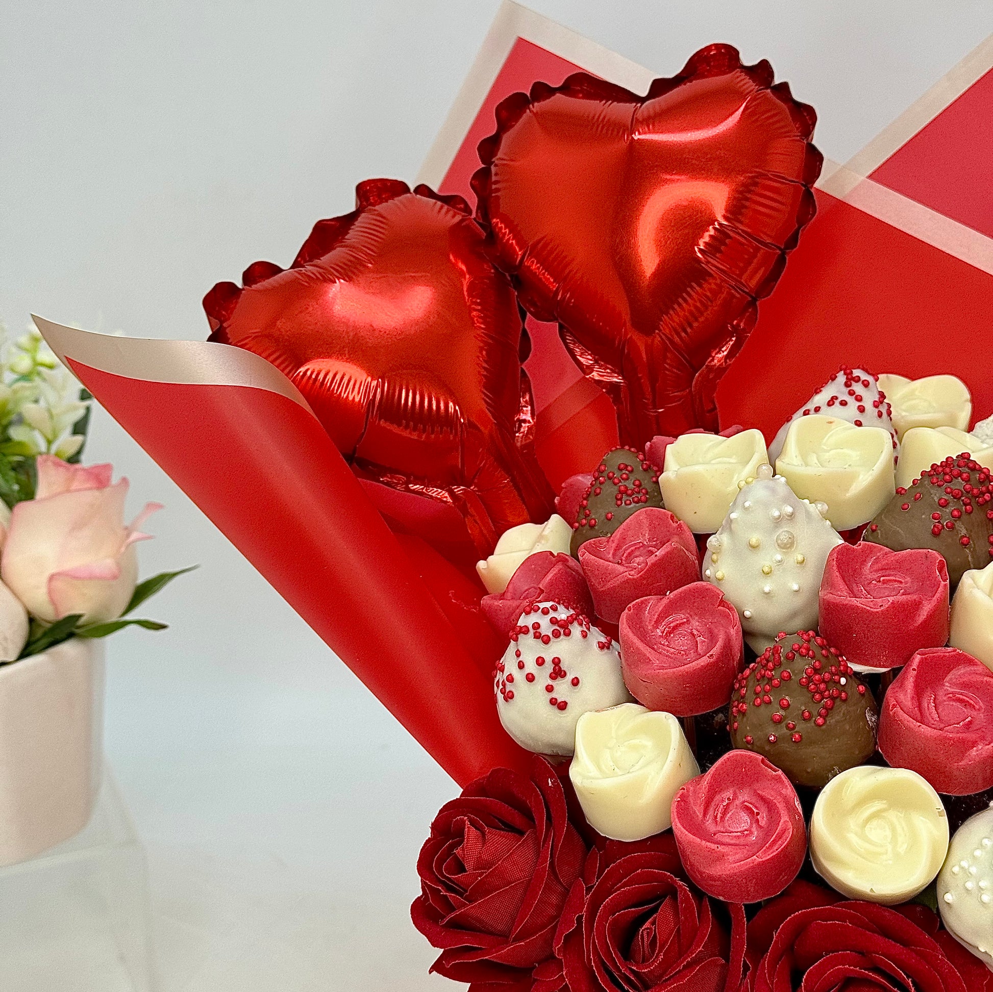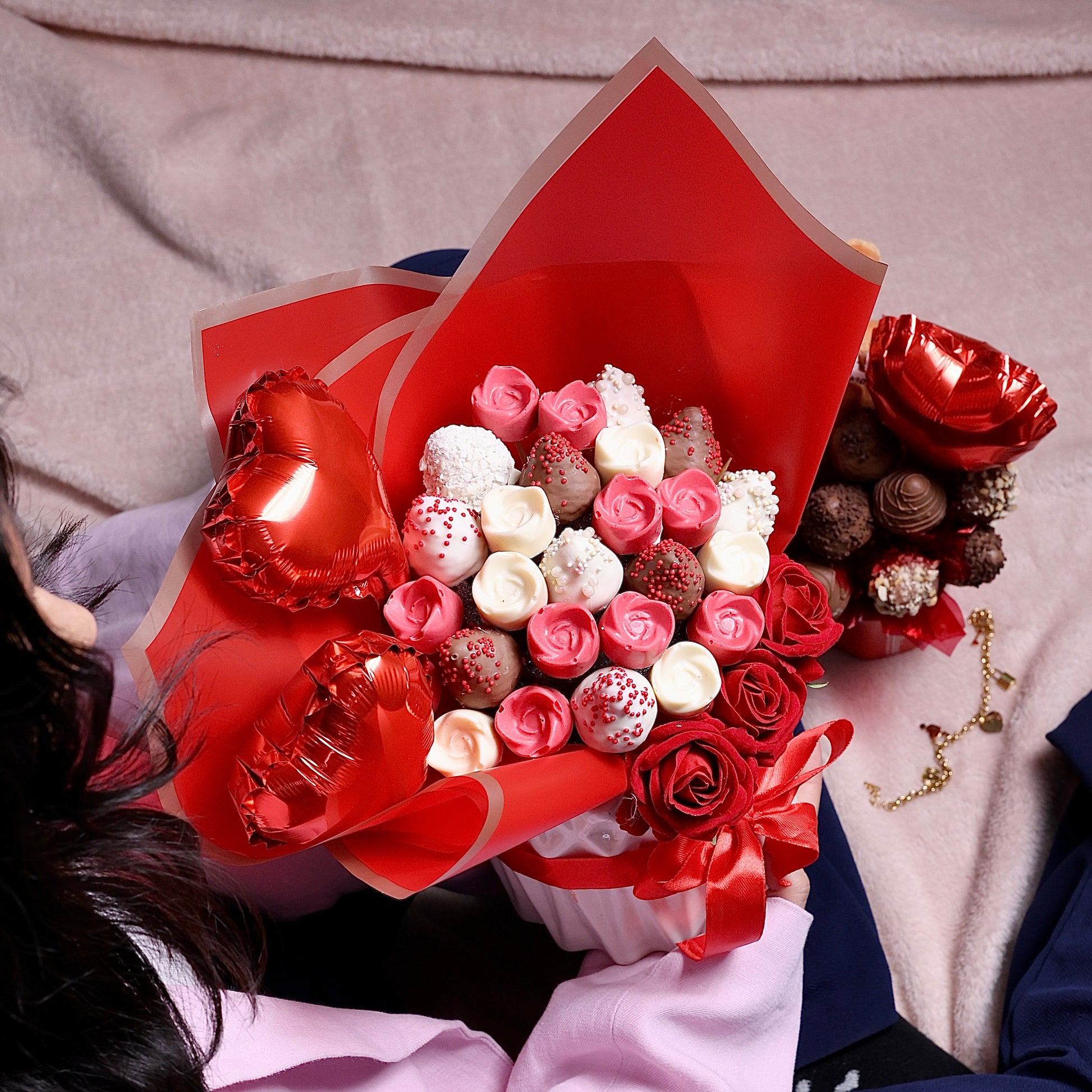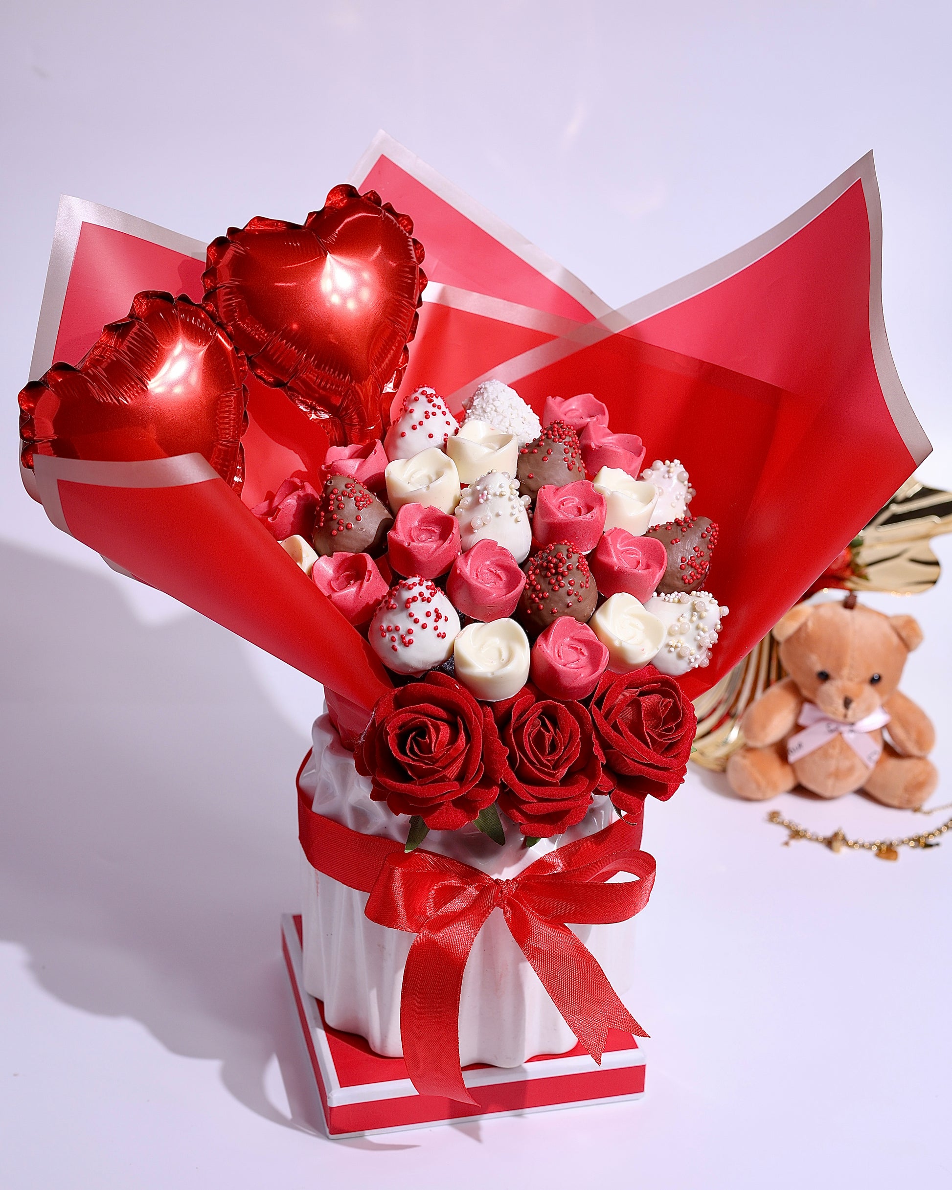Ignite love with our passionate Heartfelt Romance edible arrangement! Featuring fresh strawberries hand-dipped in milk, white, and red chocolate, with sprinkles and textures. Presented with real red roses, a luxurious ribbon, and heart balloons, it's the ultimate romantic gift for Valentine's Day or anniversaries.