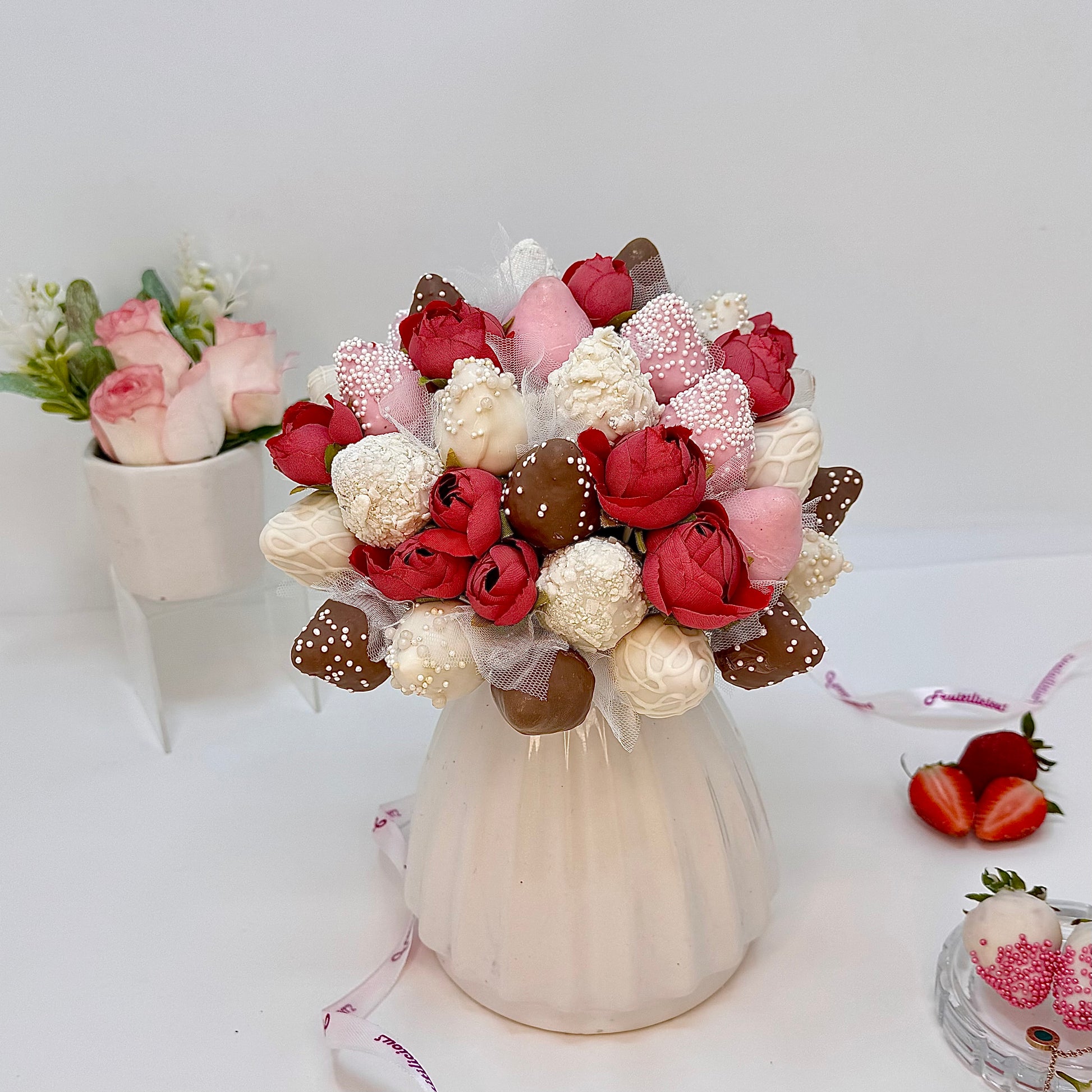 Send warmth with our delightful Roses & Cuddles edible arrangement! Featuring fresh strawberries hand-dipped in white, milk, and pink chocolate with sprinkles and unique textures, nestled with real roses. The perfect romantic gift, get well soon surprise, or sweet gesture.