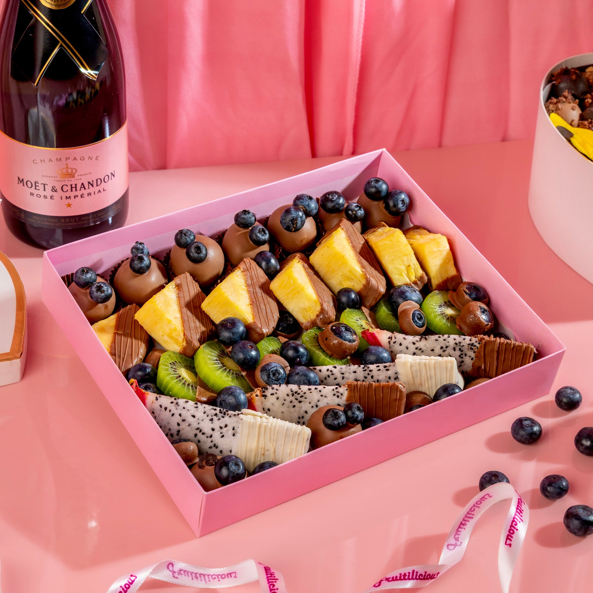A sophisticated blend of freshness and indulgence, this premium box features hand-cut pineapple, kiwi, dragon fruit, and juicy blueberries, perfectly paired with rich milk and white chocolate. Elegantly arranged in a blush pink box, it’s a luxurious treat ideal for celebrations, gifting, or simply savoring the finer things in life.