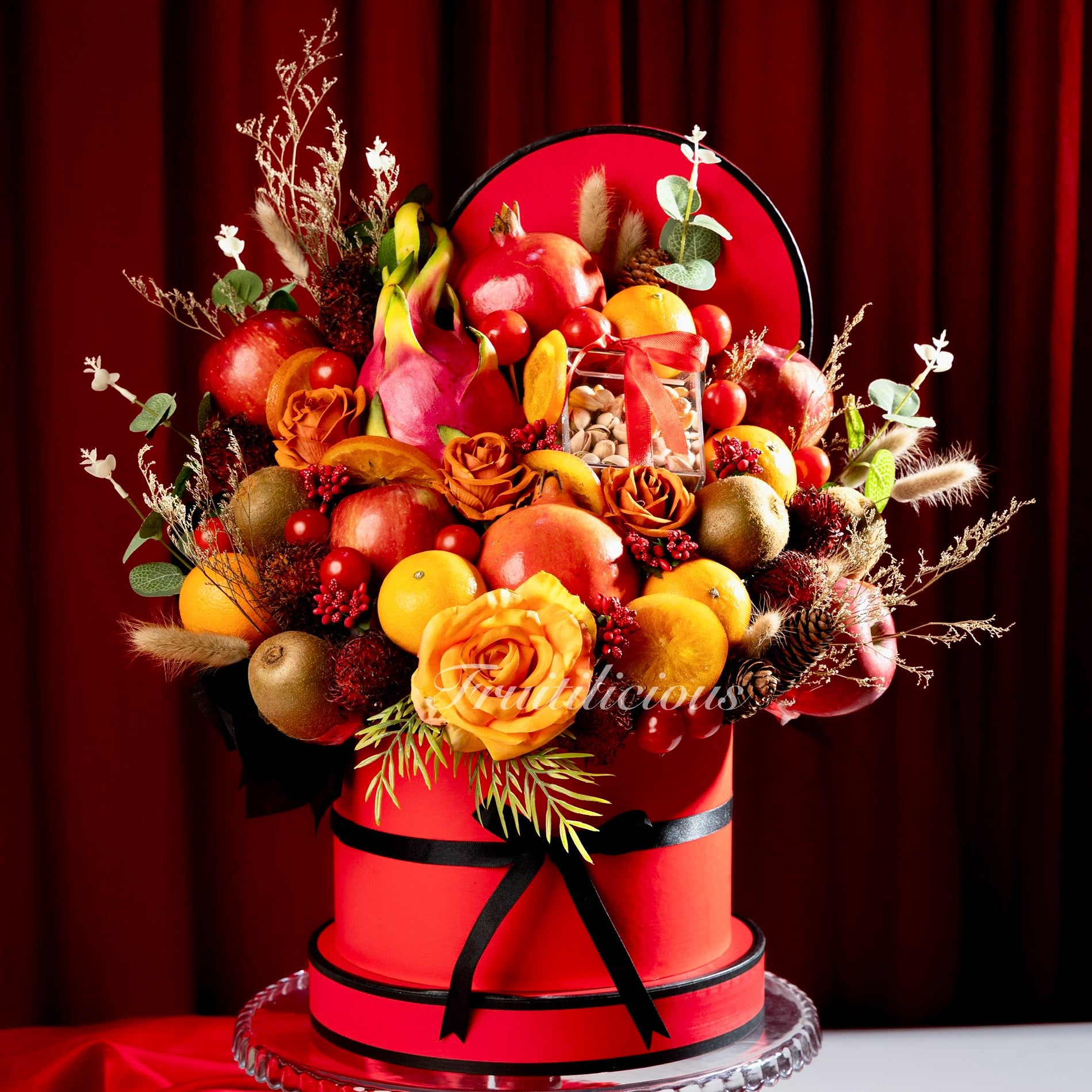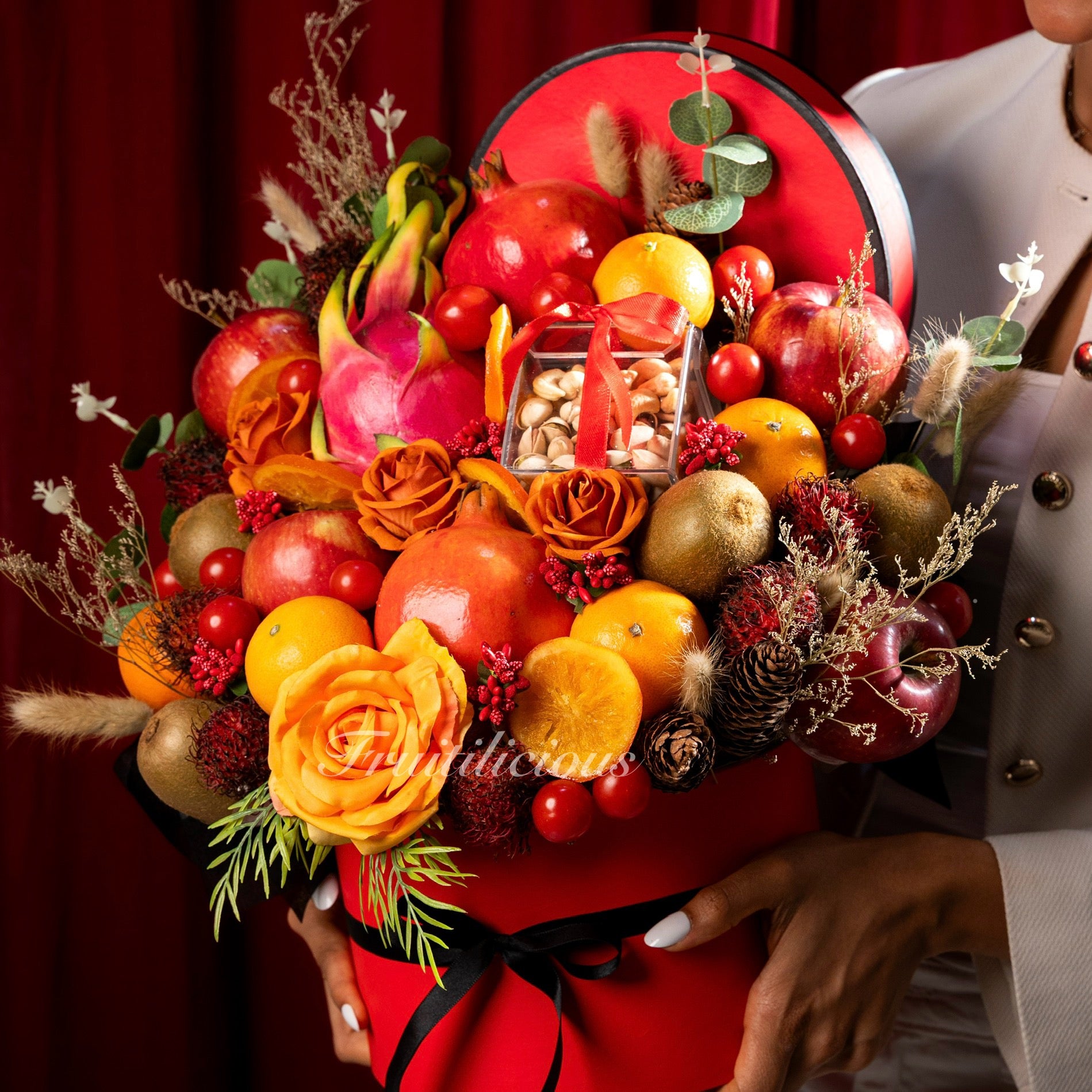 Experience the elegance of gifting with our The Royal Crimson, a luxurious fruit arrangement that exudes sophistication and warmth. Packed with 100% fresh, hand-selected fruits like pomegranate, oranges, kiwi, and dragon fruit, this premium bouquet is beautifully styled with vibrant roses and lush greenery. Each fruit is naturally ripened with no preservatives added, ensuring freshness and purity in every bite. Perfect for grand celebrations, festive occasions, or heartfelt gifting this striking red arrangement is where health meets luxury in the most beautiful way.
